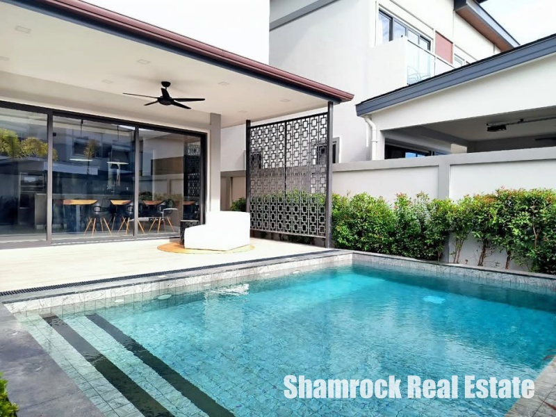 The villa offers a large open-plan living area with a European-style kitchen, flowing seamlessly to a private swimming pool with jacuzzi and a roof-covered lanai overlooking the pool — ideal for relaxing or entertaining. Additional features include a separate Thai kitchen, laundry area, and double car parking with remote control.